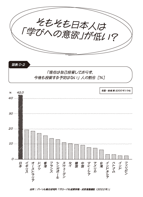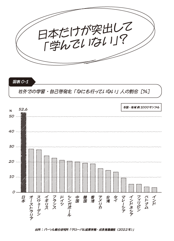 「自分の学びのために、職場の外でなにかやっていますか?」という質問項目に対して、「『学び……? とくになにもやってないですね……』と回答した人」の割合を、国別で比較してみました [図表0-1]。